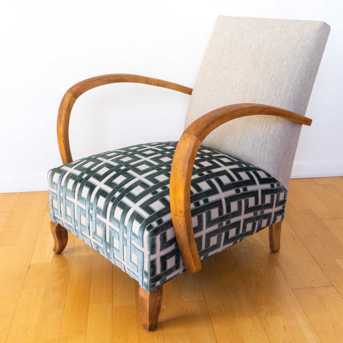 " Fauteuil Art déco revisité – rénovation en tapisserie traditionnelle – tissus d’éditeur qui valorise les matières naturelles "