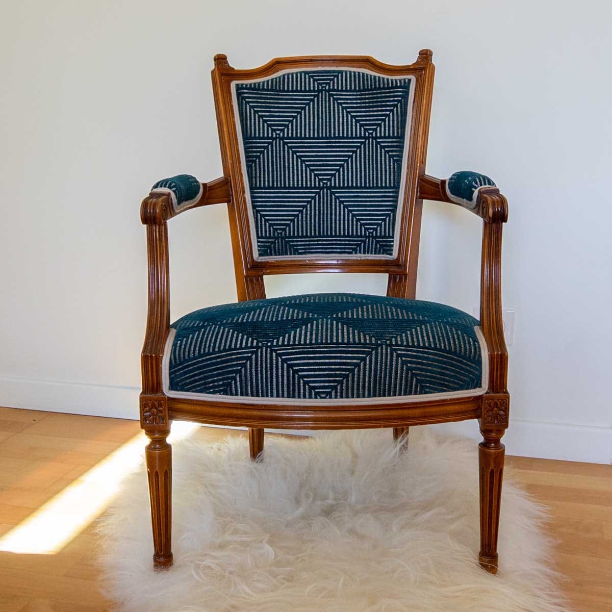 " Restauration de fauteuil – entièrement retapissé – tissus d’éditeur "